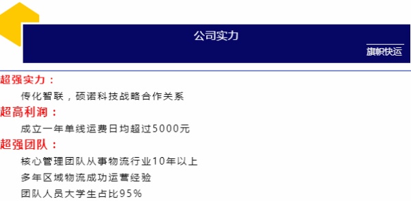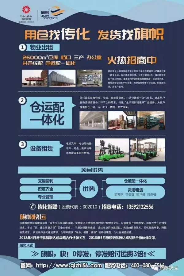 河南旗幟物流有限公司是一家從事道路運(yùn)輸、貨物配送及貨款代收的綜合型物流企業(yè),公司秉承“同擔(dān)共榮、同贏共生”的創(chuàng)業(yè)理念,牢記“快,讓生活更方便”的企業(yè)使命,不斷加強(qiáng)團(tuán)隊(duì)建設(shè),通過(guò)物流團(tuán)隊(duì)、先進(jìn)的信息技術(shù)、簡(jiǎn)化物流環(huán)節(jié)、降低物流成本,滿足客戶多元化的需求,為客戶提供便捷的物流服務(wù),為社會(huì)創(chuàng)造效益。