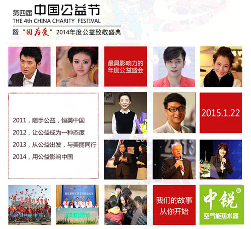 第四屆中國公益節(jié)評選工作已正式完成,在本屆活動評選中,鑒于中銳空氣能多年來在積極推動中國公益事業(yè)發(fā)展方面所作出的貢獻,經(jīng)評委會審議,中銳獲評2014年度最佳公益踐行獎;中銳董事長葉世樂先生獲評2014中國公益獎-人物獎。中銳并受邀出席將在京舉行的中國公益節(jié)“2014年度公益致敬盛典”。