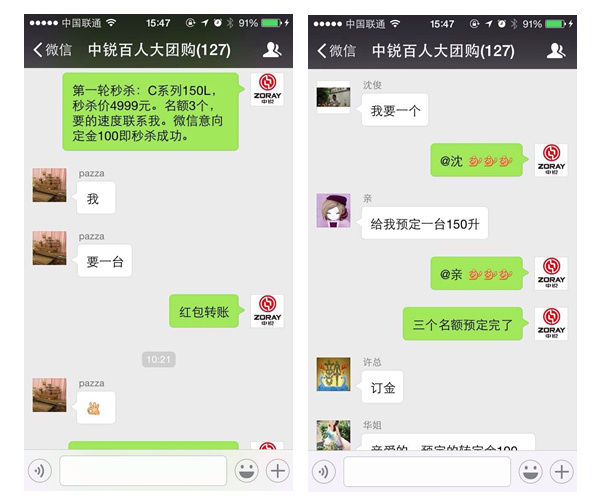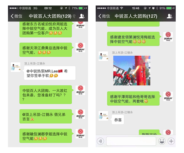 5月17日,中銳福州分公司發(fā)起一次空氣能熱水器微信下單活動——“中銳空氣能百人大團購”,動動手指,足不出戶,中銳空氣能熱水器就會自己送上門!活動開啟后,客戶爭先恐后到“中銳百人大團購”微信群里下單,好不熱鬧!