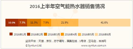 根據(jù)2016上半年6個(gè)月空氣能熱水器的銷售情況來(lái)看,1-4月的銷售比較穩(wěn)定,5月份的銷售占比21.9%,而到6月份之后,年中大促帶來(lái)的銷售刺激使其銷售占比達(dá)到41.6%??諝饽軣崴髟诖蟠贂r(shí)期的熱銷,一方面由于其市場(chǎng)均價(jià)相對(duì)其他類型熱水器較高——上半年空氣能熱水器市場(chǎng)均價(jià)為6355元,遠(yuǎn)高于磁能熱水器的4763元和太陽(yáng)能熱水器的4500元,根據(jù)以往星圖數(shù)據(jù)的監(jiān)測(cè)顯示,在大促時(shí)間消費(fèi)者更愿意選購(gòu)均價(jià)較高的商品;另一方面,顯示出空氣能熱水器的線上市場(chǎng)銷售見(jiàn)好??諝饽軣崴饔胁煌陔姛崴骱腿?xì)鉄崴鞯膬?yōu)點(diǎn),近年來(lái)消費(fèi)者的認(rèn)知程度提高,未來(lái)發(fā)展前景較好。